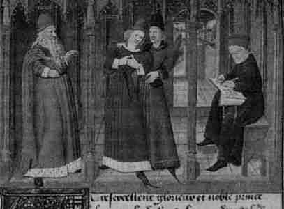 Рис. 23. Старинная миниатюра, якобы XV века, на которой «античный» Цицерон и другие «античные» персонажи изображены как средневековые люди в средневековой обстановке. Современный комментарий: «Лелиус (Lelius) (слева), Энниус (Ennius) и Сцевола (Scaevola) (в центре); Цицерон (Cicero) сочиняет трактат „О дружбе“» [1485], с. 163