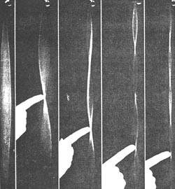 Рис. 1. Свободно колеблющаяся открытая струна издает основной тон. Если точно посредине струны создать узел колебания, то издаваемая струной нота станет на октаву выше и будет гармонировать с исходной нотой. Другие гармоники мы получим, перемещая узел в другие положения, соответствующие простым дробям (например, трети, четвертой или пятой части) от полной длины струны