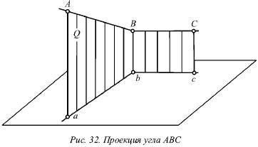 Плоскость, в которой находится сторона угла АВ и ее проекция ab , перпендикулярна горизонтальной плоскости, так как содержит перпендикуляр Вb к этой плоскости. Прямая ВС перпендикулярна плоскости Q вследствие ее перпендикулярности двум пересекающимся прямым этой плоскости (АВ и Вb ). Прямая bc параллельна ВС , т. е. она также перпендикулярна Q , а значит и прямой ab , которая лежит в ней.